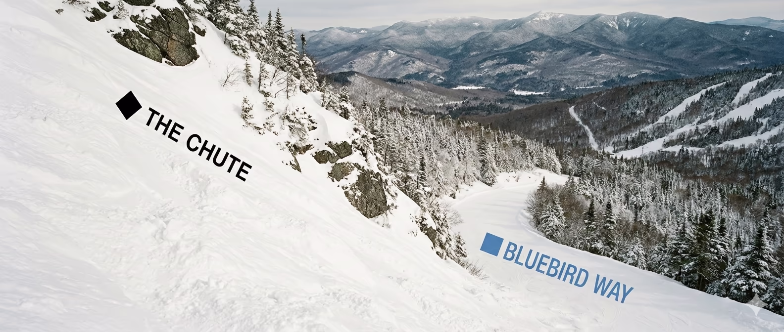 Generated by Nano Banana Pro with prompt “Wide, realistic photograph from the top of a ski mountain showing two diverging runs: one steep, straight black-diamond slope dropping sharply downward, and one gentler blue run curving off to the right. No people visible. Natural winter light, editorial photography style, restrained color grading”